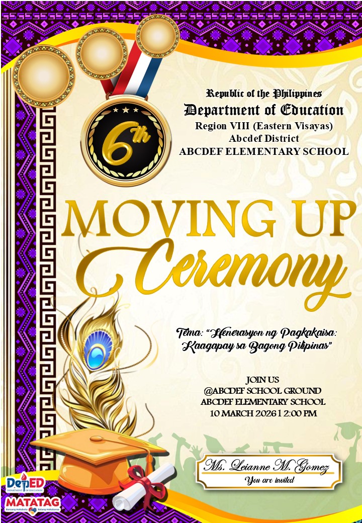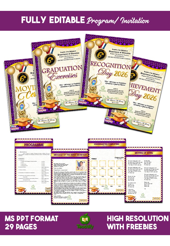 Elevate your school’s milestone events with a complete, beautifully designed, and fully editable template package. Perfect for Graduation, Moving-Up, Recognition, and Achievement Ceremonies, this collection brings elegance, organization, and cultural-inspired style to any school celebration.