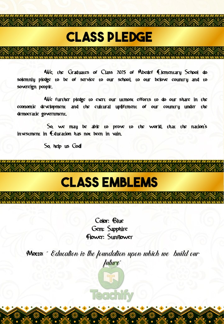 Elevate your school ceremonies with timeless elegance and cultural distinction using the Gold Tribal Prestige Collection Invitation Templates—professionally designed for graduation, moving-up, recognition, and achievement programs. Featuring a luxurious gold palette accented with refined tribal-inspired elements, this collection symbolizes excellence, honor, and academic prestige—perfect for formal and high-profile school events.