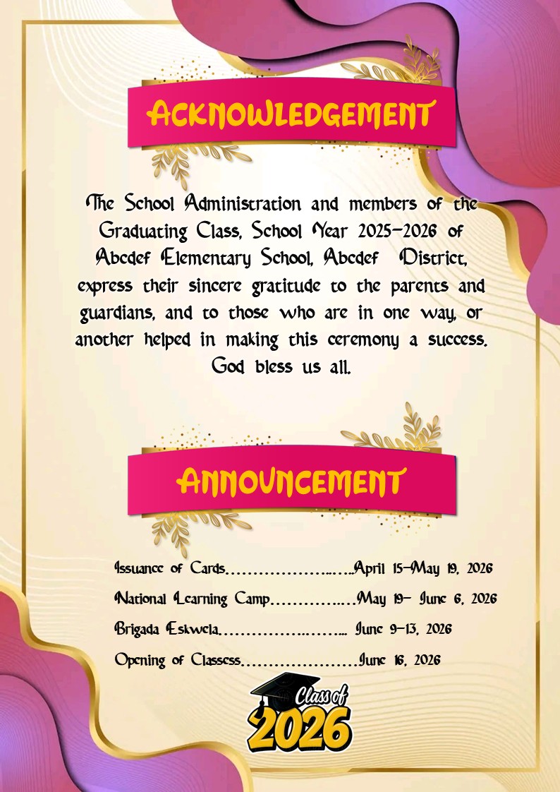 Celebrate school milestones with vibrancy and charm using the Fuchsia Lilac Collection Invitation Templates—professionally designed for graduation, moving-up, recognition, and achievement ceremonies. Featuring a lively blend of fuchsia and lilac, this collection adds a modern, playful, yet elegant touch to any event.