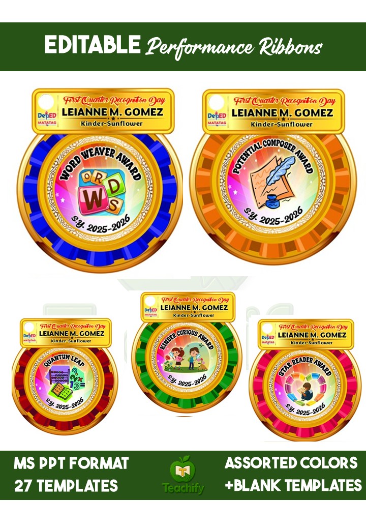 Elevate your recognition ceremonies with these medal-inspired performance ribbons, aligned with DepEd Order No. 36, s. 2016. Ideal for public and private schools, and perfect for Kinder learners!